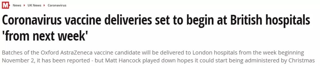 根据《镜报》发布的报道,从11月2日开始,牛津大学和AstraZeneca研发的新冠疫苗将会被分批运往伦敦的各大医院,准备开始接种。