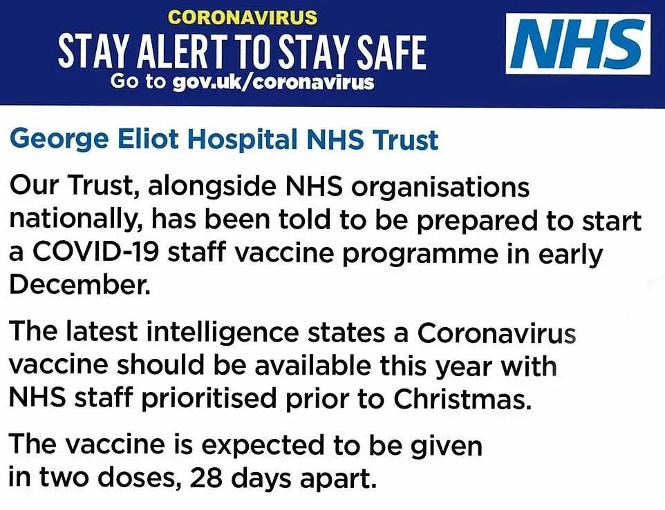 位于华威郡的George Eliot Hospital NHS Trust已经接到了相关通知,预计在12月初为医院的医护人员接种新冠疫苗。