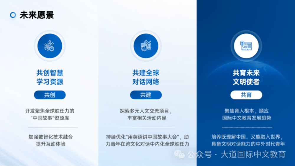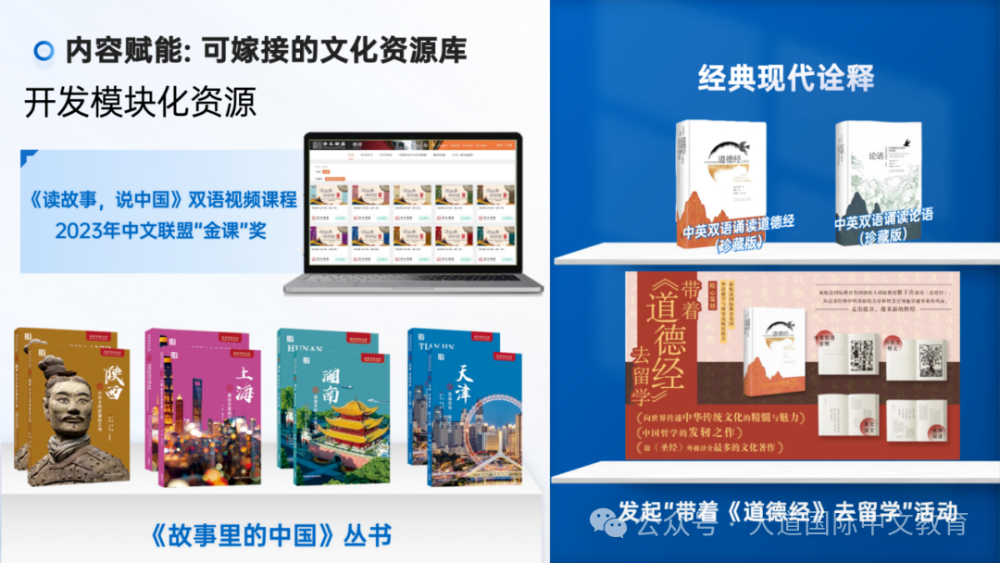 近年来,新航道始终以“培养具有中国根基和全球胜任力的青少年”为使命。在内容赋能上,与教育部中外语言交流合作中心等机构联合打造“故事里的中国”系列丛书,推出的《读故事,说中国》双语视频课程曾荣获2023年中文联盟数字化教学“金课”奖;策划出版中英美三国专家联袂打造的《中英双语诵读道德经(珍藏版)》《中英双语诵读论语(珍藏版)》,并发起“带着《道德经》去留学”活动。在平台赋能上,举办的“用英语讲中国故事大会”活动已吸引全球142个国家和地区的近140万名青少年参与,为他们创造了真实的跨文化交际场景。